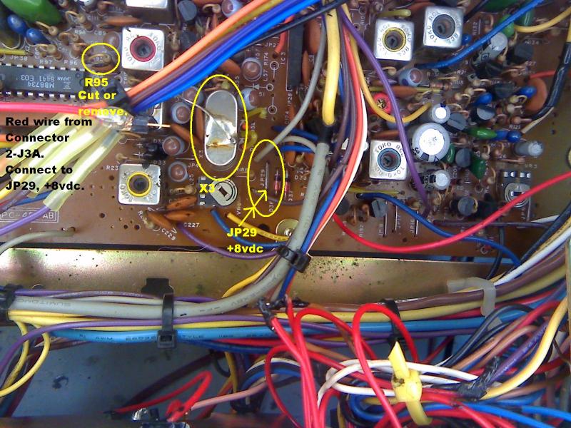 7. Remove R95. Located close to the PLL IC. If your VCO still will not cover all the bands, replace R98 with a 120k ohm.