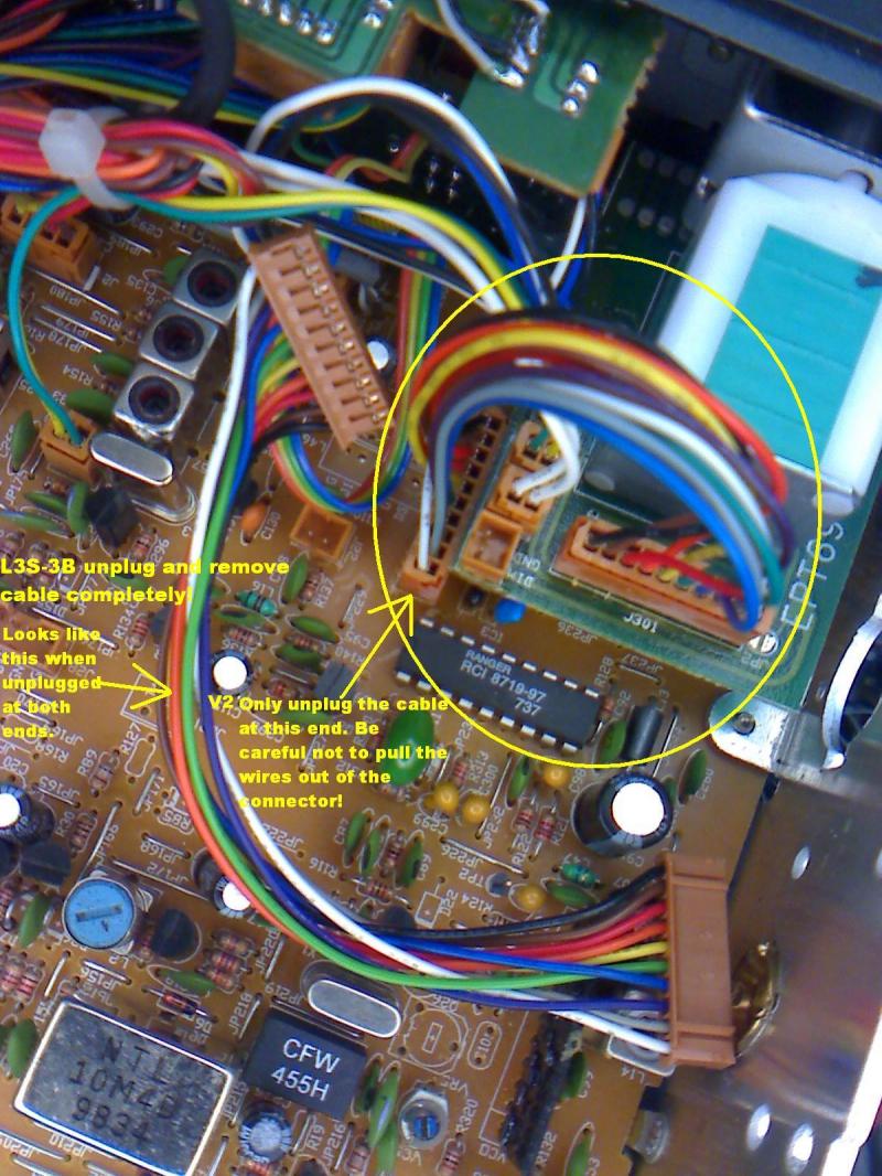 2. Unplug the multi colored cable, that comes from the channel selector board, Remove it completely for the L3S-3B.