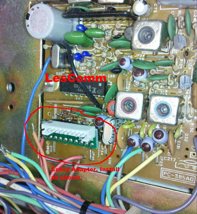 The picture below shows the wires from the channel selector properly connected to the J1a cable and heat shrink protects the solder connection. The cable can be plugged directly into the Cobra Adapter to bypass the Lescomm board and restore the radio to operation for troubleshooting purposes. But you must reground pin 10 for it to work.