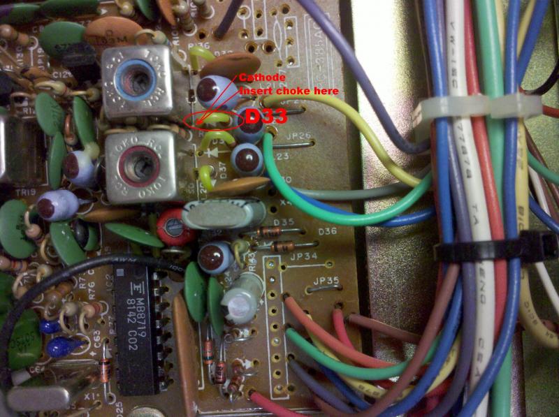 2a. Lift the Cathode end of D33 (1S1588) and insert the enclosed 3.3uh choke between the diode and pcboard.