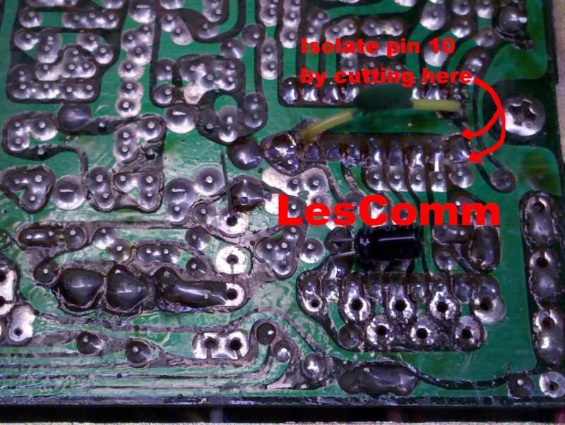 3. Since Pin 10 is permanently grounded, we must isolate it so we can use it. Cut the ground plane run as illustrated below. *** On the Madison with a PC411AD board, pin 10 is already isolated from ground.