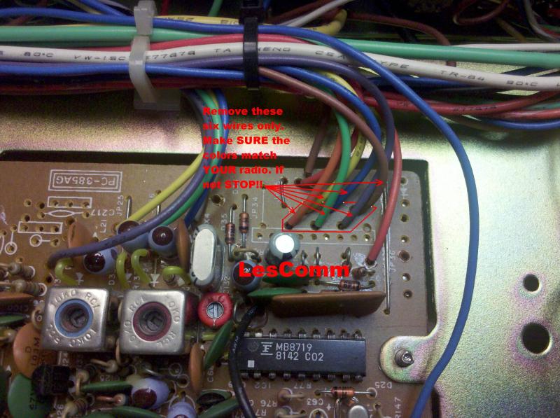 6. Locate the muti colored wires coming from the Channel Selector board and connecting to the main board. Make sure the colors in the pigtail harness match the colors in your radio! If not, STOP!! Contact Tech Support.
